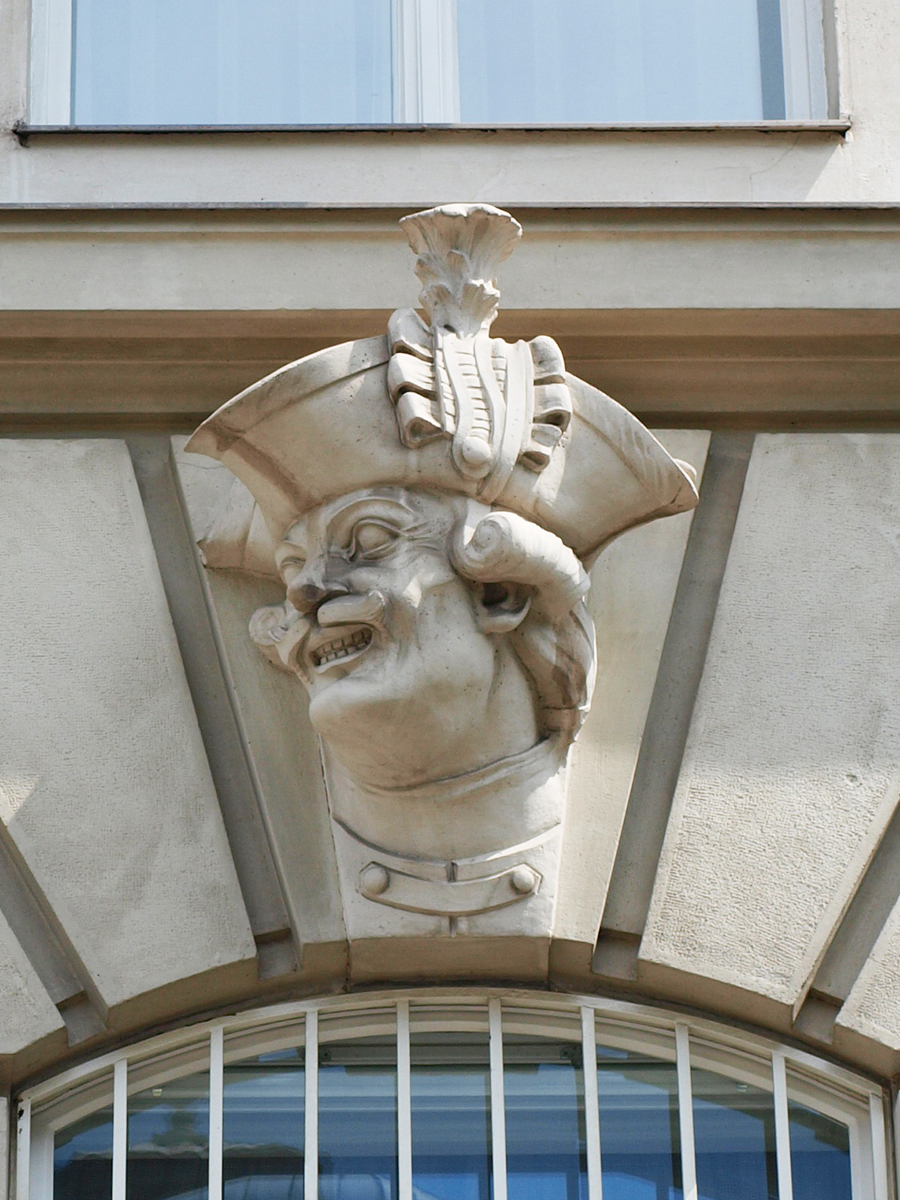 Die Schlussstein-Soldatenköpfe des Bildhauers Wilhelm Hejda (1868-1942) über den Hochparterrefenstern des Ministeriums verweisen auf die Zeit, als der Stubenring 1 noch das Reichskriegsministerialgebäude beherbergte (1913-1918).