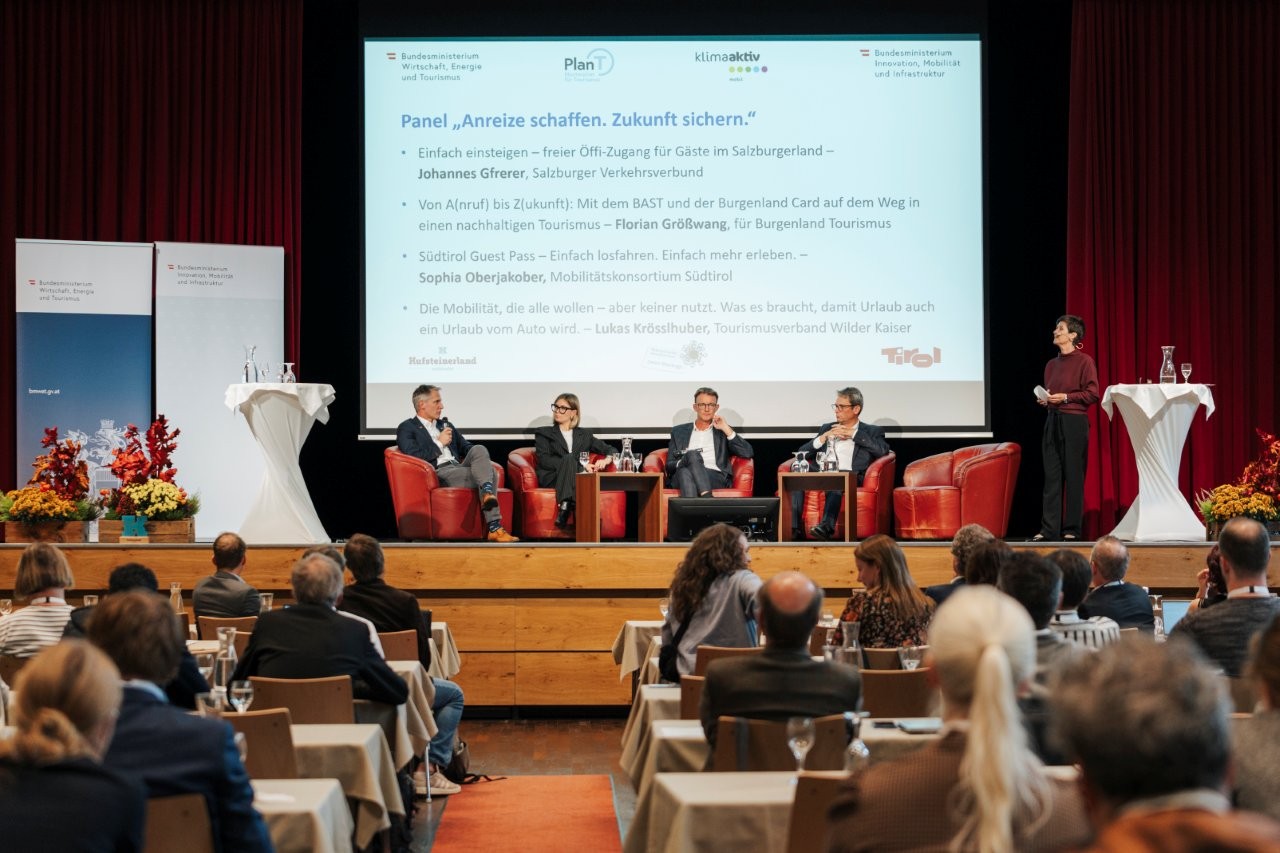 Das Panel 2 "Anreize schaffen. Zukunft sichern." widmete sich unterschiedlichsten Mobilitäts-Anreizsystemen in ganz Österreich, die den Gästen erleichterten Zugang zu öffentlichem Verkehr bieten. Präsentiert wurden bereits erfolgreich umgesetzten Tourismus-Mobilitätskonzepte aus vier Tourismusregionen: Es gab einen Überblick über das jeweilige Mobilitätsangebot sowie Einblicke in Kostenstrukturen, Herausforderungen und Potentiale: